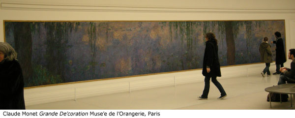 Monet never visited Japan, but eagerly, in the 19th Century fashion, collected Japanese prints, which decorated the walls of the Giverny house. More importantly, though, his decision to abandon the isolated rectangle format of his earlier exhibition easel paintings and to extend his late pictures into very long panoramas stretched along the length of a wall, most likely was influenced by his interest in monumental Japanese screen paintings. Some of these were nearly two metres high and over seven metres long, and traditionally functioned as integral elements in Japanese architecture: as ceremonial backdrops for dignitaries, as room dividers, and sometimes as actual sliding walls.
