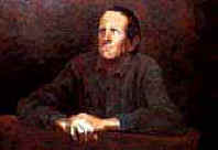 Those who know Ray Crooke only for his island paintings, however, may be surprised by his versatility. He has painted religious subjects and still lifes, and recorded outback and farm landscapes, bush towns and Sydney Harbour. Crooke is also a skilled portrait painter and the exhibition includes such outstanding works as the Portrait of George Johnston 1969, which won the 1969 Archibald Prize, and Portrait of Dick Roughsey 1982. The image to the left is a detail of the Johnston portrait. |